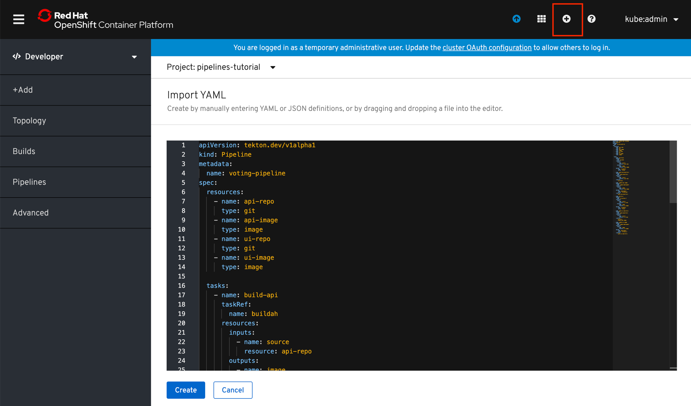 Alternatively, in the OpenShift Web Console, you can click on the + at the top right of the screen while you are in the pipelines-tutorial project: