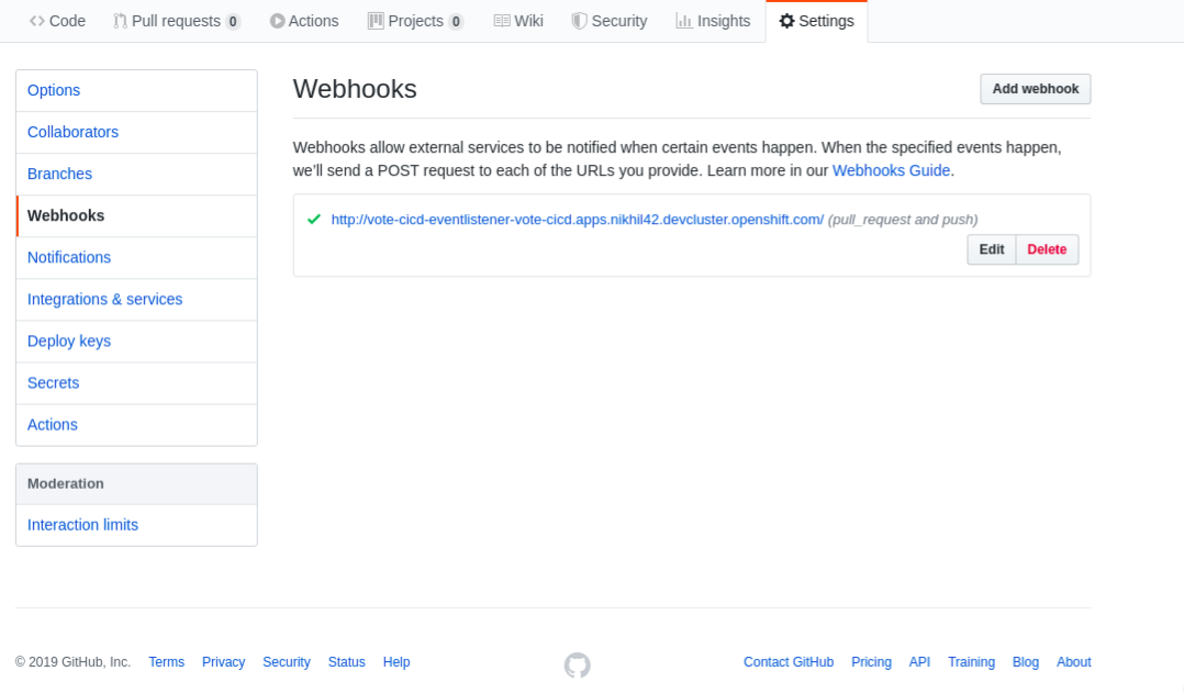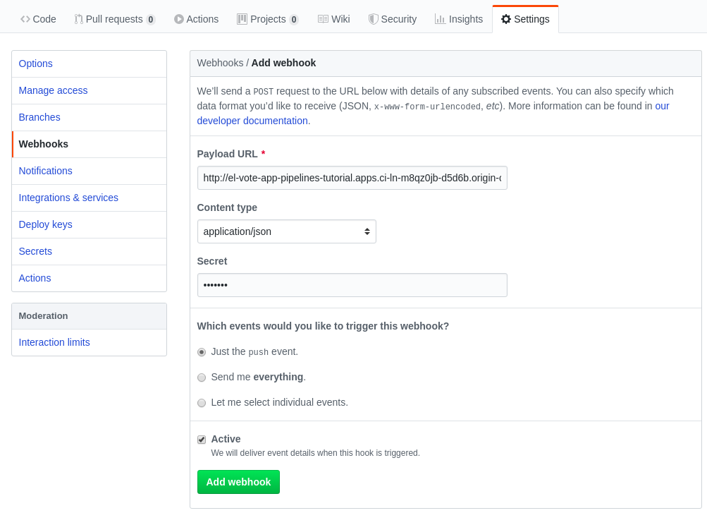 echo "URL: $(oc get route el-vote-app --template='http://{{.spec.host}}')"Configure webhook manually